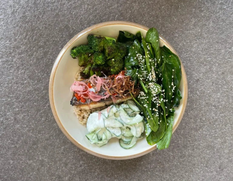 Ginger-soy marinated mackerel fillet, with marinated spinach and cassava leaves curry on bed of coconut rice, topped with pickled shallots, coconut cucumber and fermented chili