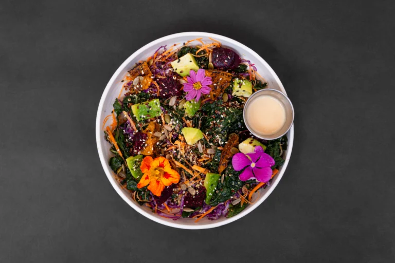Tuscan kale, quinoa, roasted pumpkin, roasted beetroot, shredded carrot, red cabbage, diced avocado, topped with mixed seeds and tahini honey soy dressing.