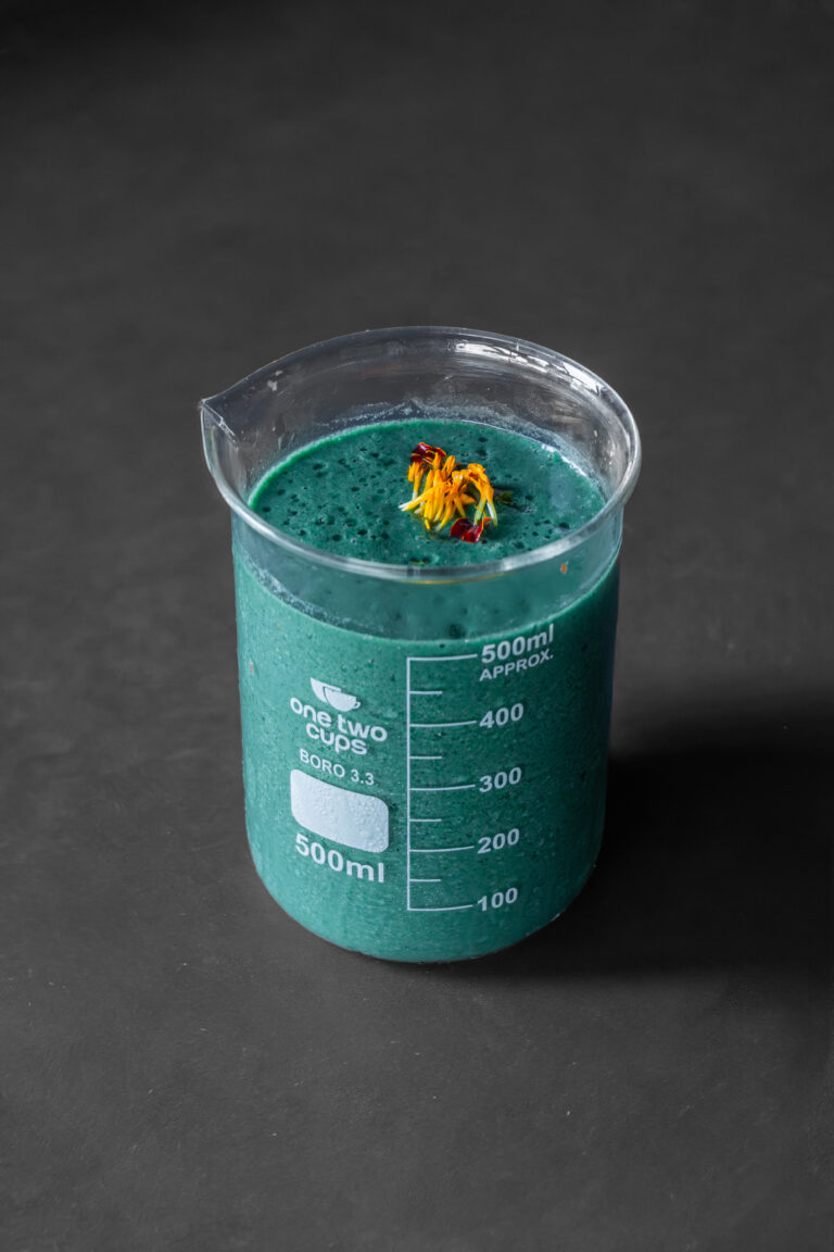 Mango, Coconut Yoghurt, Spirulina, Spinach, Peppermint, Ginger, Chamomile, Marshmallow root, Coconut water, Himalayan Salt.
