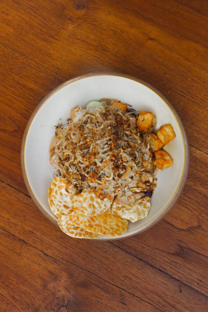 Ketoprak is a vegetarian street food dish native to Jakarta. Consisting of vermicelli noodles, tofu, beansprout, cucumber, rice cakes, shallots, garlic, tempe chips and our special house made Ketoprak sauce. Unlike typical Indonesian dishes, it’s not hot or spicy and has a unique flavour profile that balances soy, Ketoprak and garlic.