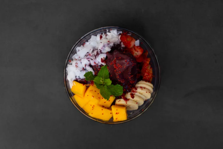 100% organic açai topped with house-made granola, coconut flakes, fresh mango, sliced banana and mint leaves.