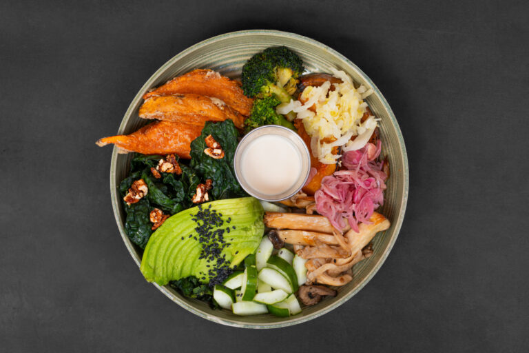 Massaged kale, roasted pumpkin, broccoli, sweet potato, sauteed mushrooms, cucumber, sliced avocado, sauerkraut, pickled shallots, brittle cashew nuts, served with a side of tahini honey soy dressing. (GF DF , contain nuts)